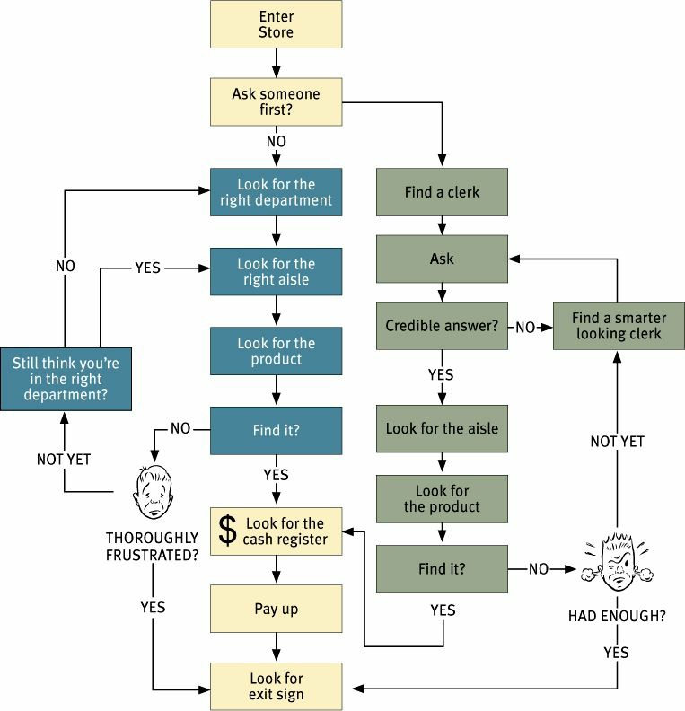 이 결정은 여러 변수에 기반합니다. 상점에 얼마나 익숙한지, 그들이 물건을 합리적으로 정리할 수 있는 능력을 얼마나 신뢰하는지, 얼마나 급한 상황인지, 그리고 얼마나 사교적인지 등이 있습니다. 이 결정을 고려할 때, 과정은 다음과 같이 보입니다. 주목해야 할 점은, 스스로 찾기 시작한다 해도, 만약 제대로 찾지 못할 경우 언젠가는 누군가에게 방향을 물어볼 가능성이 높다는 것입니다.