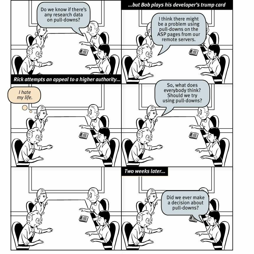 요점은 "대부분의 사람들이 풀다운 메뉴를 좋아합니까?"와 같은 질문은 생산적이지 않다는 것입니다. 올바른 질문은 "이 페이지에서 이러한 항목과 이러한 문구가 있는 이 풀다운이 이 사이트를 사용할 가능성이 높은 대부분의 사람들에게 좋은 경험을 제공합니까?"라는 질문입니다.