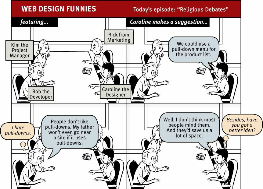 And the worst thing about the myth of the average user is that it reinforces the idea that good Web design is largely a matter of figuring out what people like. It's an attractive idea: Either pull-downs are good (because most people like them), or they're bad (because most people don't). Stories should be on a single long page, or they should be broken up into many shorter pages. Home page carousels, mega menus, rollovers, etc. are either good or bad, black or white.